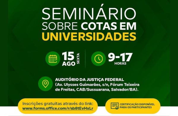 Juristas, acadêmicos e representantes da sociedade civil vão se reunir no próximo dia 15 de agosto, em Salvador, para discutir os impactos sociais, jurídicos e educacionais da política de cotas nas universidades. O seminário “Cotas nas Universidades” será realizado das 9h às 17h, no Auditório da Justiça Federal, localizado no Fórum Teixeira de Freitas (Centro Administrativo da Bahia –CAB).